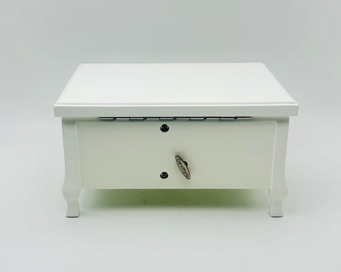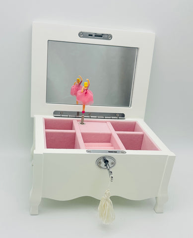 Open the lid of this musical box to reveal a ballerina in her pink tutu. Includes pedestal feet and a key, with lock; Pink velour lining. Playing the tune: "Swan Lake" Measures 8 x 6 x 4.2 Made of wood Designed to hold a variety of jewelry and other small treasures;