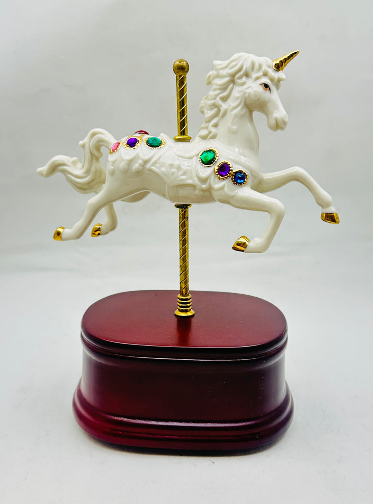 Single Carousel Unicorn Horse with gems embedded all around and trimmed in  gold. Made of fine porcelain. Horse turns as the music plays.