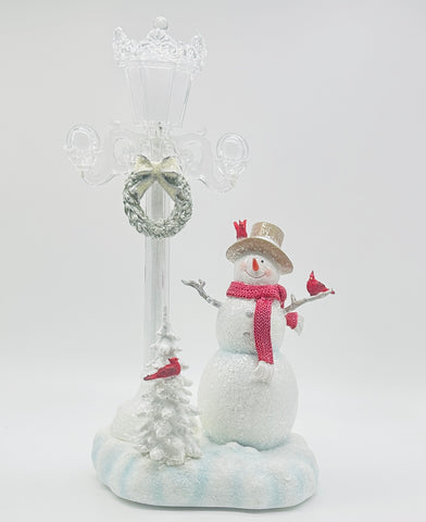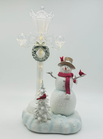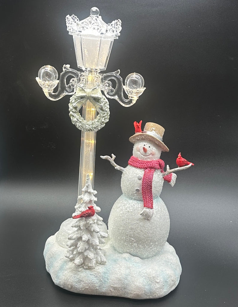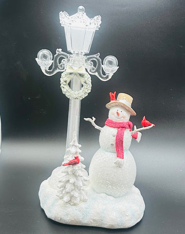 Lighted Musical Snowman & Lamp Post is a beautiful addition at Christmas Time. Playing various Christmas songs. Uses 3 AAA batteries. Made of Resin and stands 15.25 inches tall.
