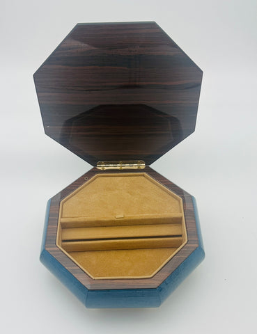 Inlaid Single Red Rose with some rose buds, in a blue stained octagon shape Elm Burl and trimmed in black around the lid. Plenty of room for jewelry and rings. Made in Sorrento Italy. A beautiful gift that will last forever. Measures 6.5 x 6.5 x 2.75 Your choice of tune.